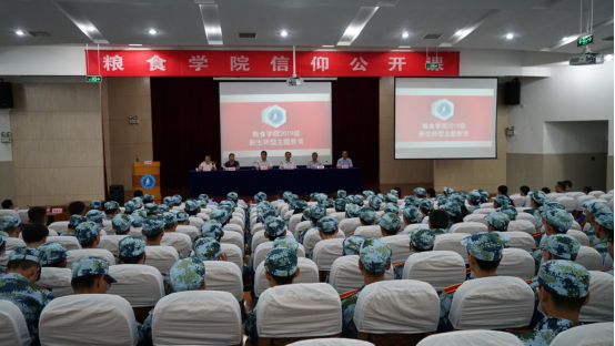 2019级徐子康同学作为新生代表发言,他号召所有新生努力做到珍惜韶华,不负青春,严于律己,不惧困难,做时代的追梦人,做自己的圆梦人。随后,在19级粮食工程专业新生王红艳的带领下,全体学生起立宣誓“守护食安,奉献粮工。弘扬‘四无粮仓’精神,维护食品安全与荣誉”,声声誓言,响彻大厅。