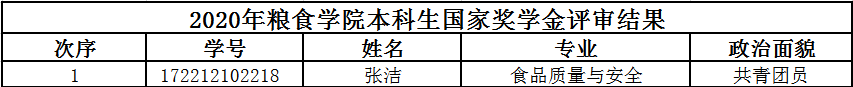 根据《江苏科技大学本科生国家奖学金评选办法》(江科大校〔2017〕172号)、《江苏科技大学粮食学院本科生评奖评优补充规定》的有关规定,本着公平、公正、公开的原则,经本人申请,粮食学院国家奖学金评审领导小组严格初审,确认2020年粮食学院本科生国家奖学金初审通过一人,名单如下,现予以公示:
