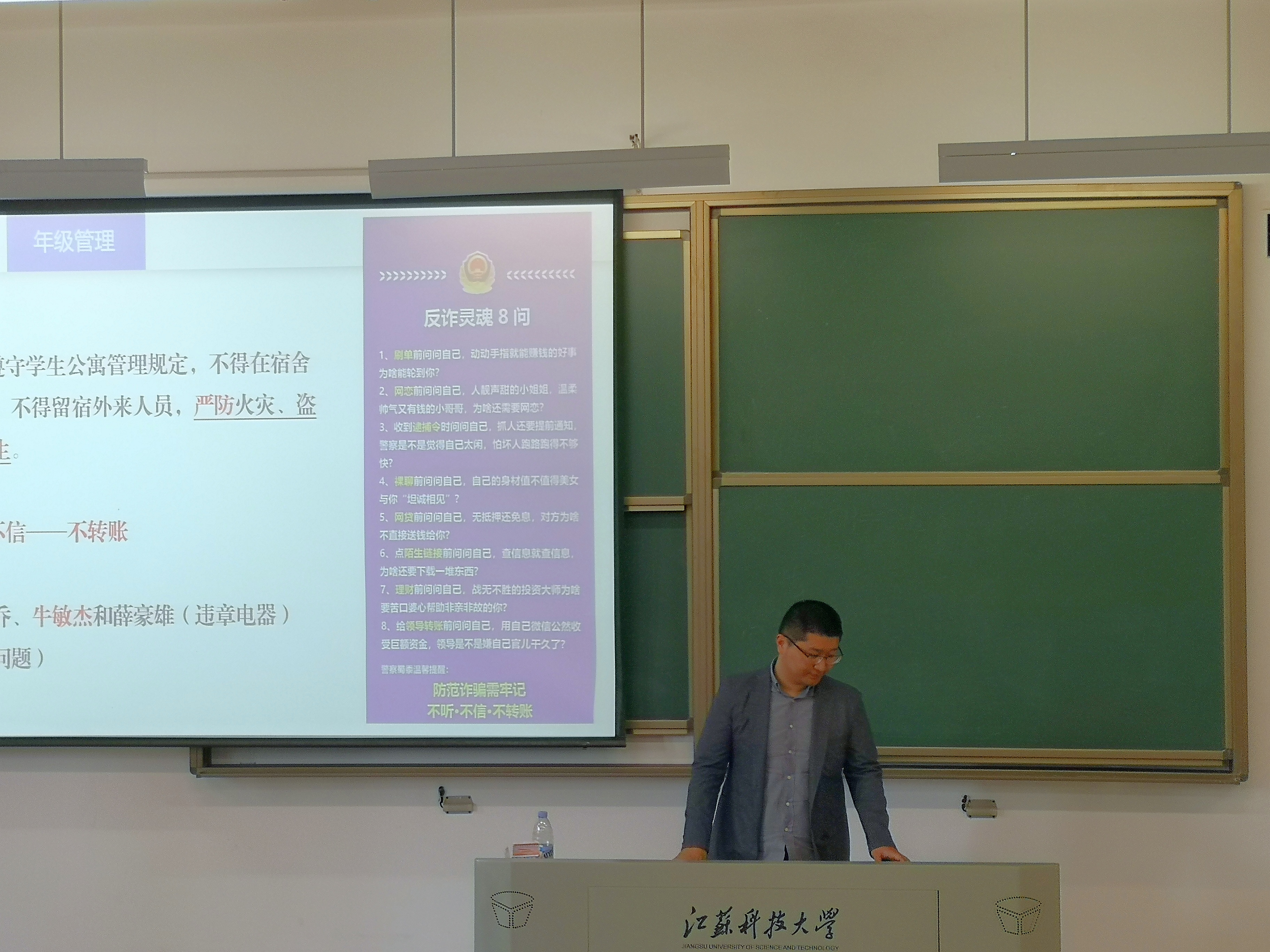 针对防范诈骗,纪老师向大家展示“反诈骗灵魂8问”,告诫同学们要小心网络陷阱,网上交友要谨慎,聊天视频莫当真,陌生链接不要点;要妥善保管个人信息,身份信息、银行卡密码不外传。