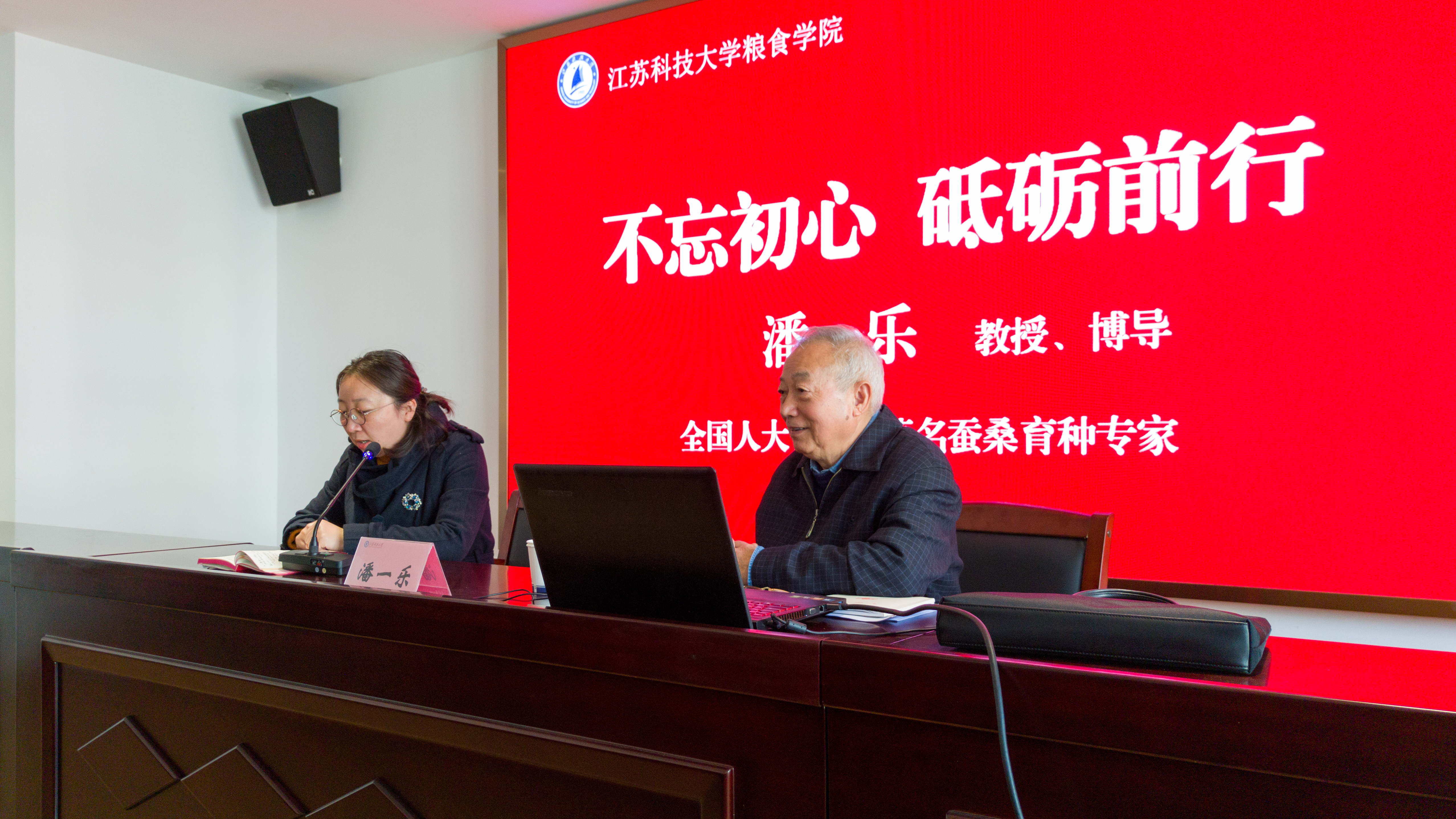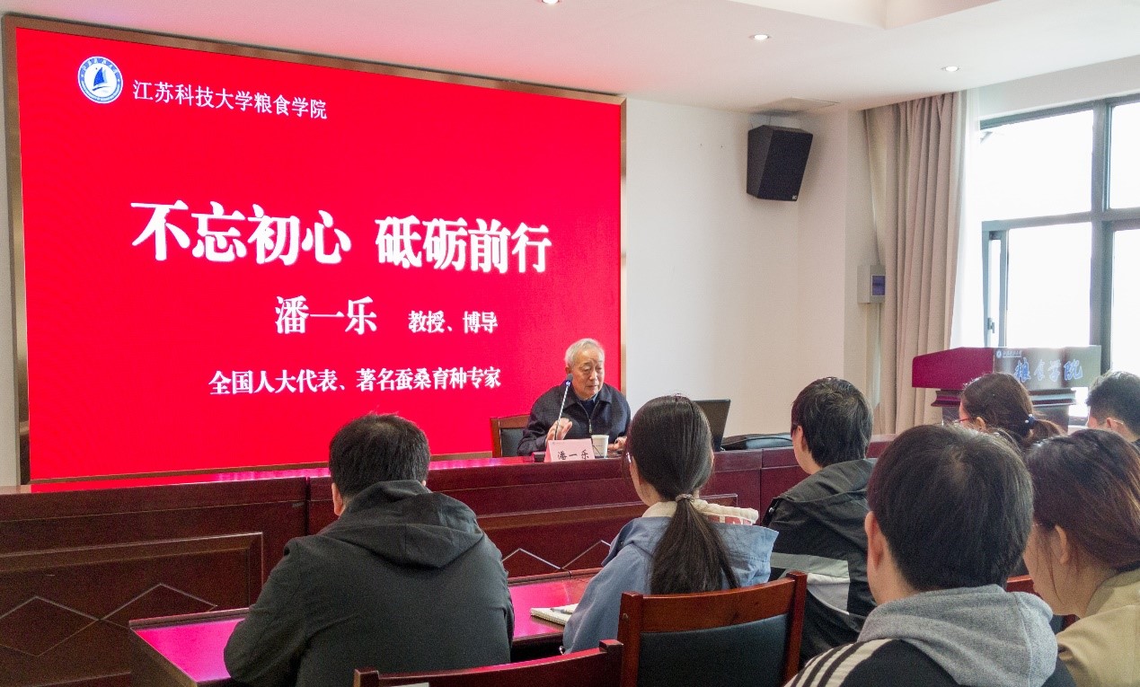 潘一乐教授与大家分享了自己的成长之路,讲述了他在求学和科学研究工作的经历,他治学严谨、不辞辛劳,足迹遍及新疆、西藏、云南等地,为我国的蚕桑事业默默奉献,并因成绩显著而获得了国家科技进步二等奖等诸多荣誉。在担任全国人大代表十五年的过程中,他牺牲了许多休息时间,科学地安排好本职工作、社会工作和人大代表工作,认真履行代表职责,发挥党和政府联系人民群众的纽带和桥梁作用,是一名受人民群众爱戴的人大代表。退休后,他为了使古老的蚕桑行业绽放异彩,提出了“栽桑养人,走健康之路”的新思路,取得了良好的生态社会效益。