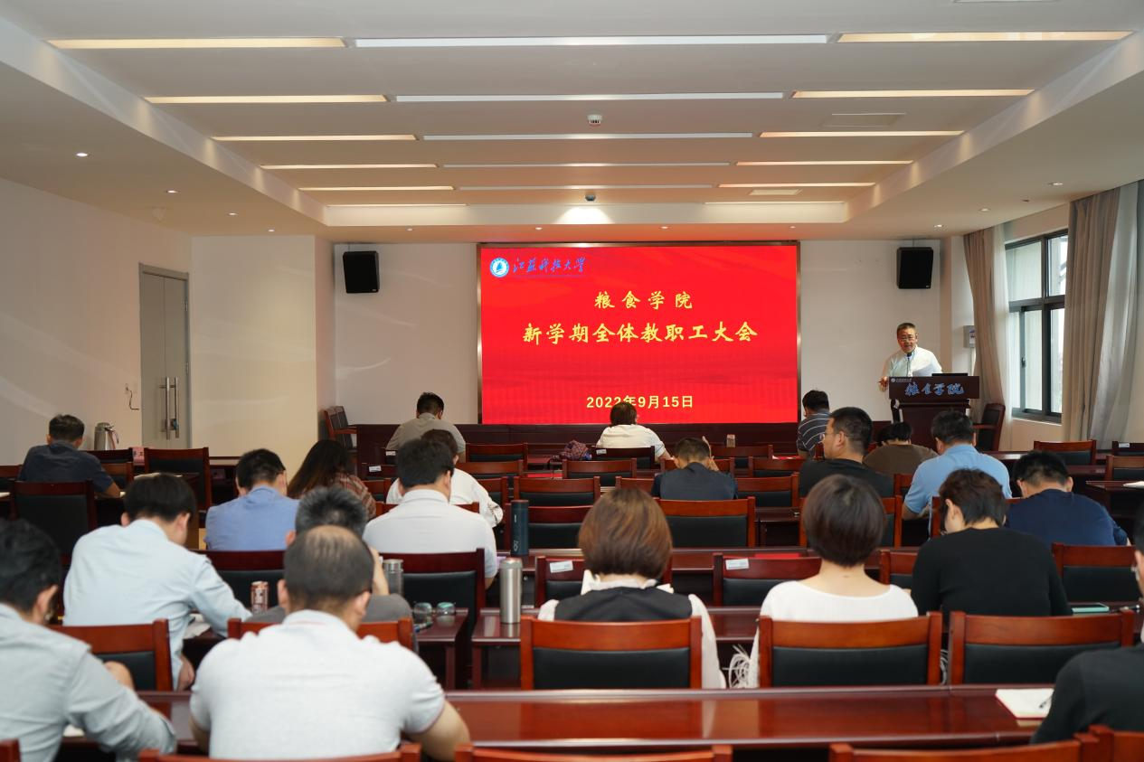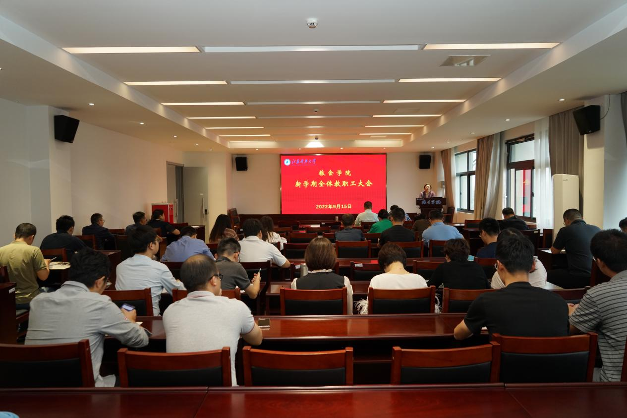 为推进学院新学期各项工作有序顺利开展,确保学院年度目标工作任务完成,9月15日上午,竞彩足球app 在学院440报告厅召开新学期全院教职工大会,学院领导班子、全体教职工参加了会议。本次会议主要分两阶段:一是总结上半年学院工作,部署和推进下半年重点工作;二是院史发展报告会。