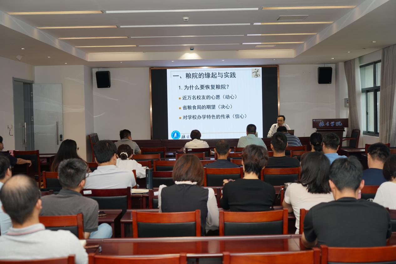 随后,学院特邀请原党总支书记李炳义研究员为全体教职工作题为《粮院的缘起与实践》的专题报告。李炳义研究员从学院办学渊源、恢复发展等出发,详细介绍了学院发展历程和学院发展中一些好的措施,并向大家分享了其个人多年工作体会和思考,寄语青年教师找准自己定位,谋求良性发展。整个报告内容详实,鼓舞人心。参会教师特别是新教师纷纷表示听了报告会,体会深、收获大,对学院今后的发展更坚定了信心。