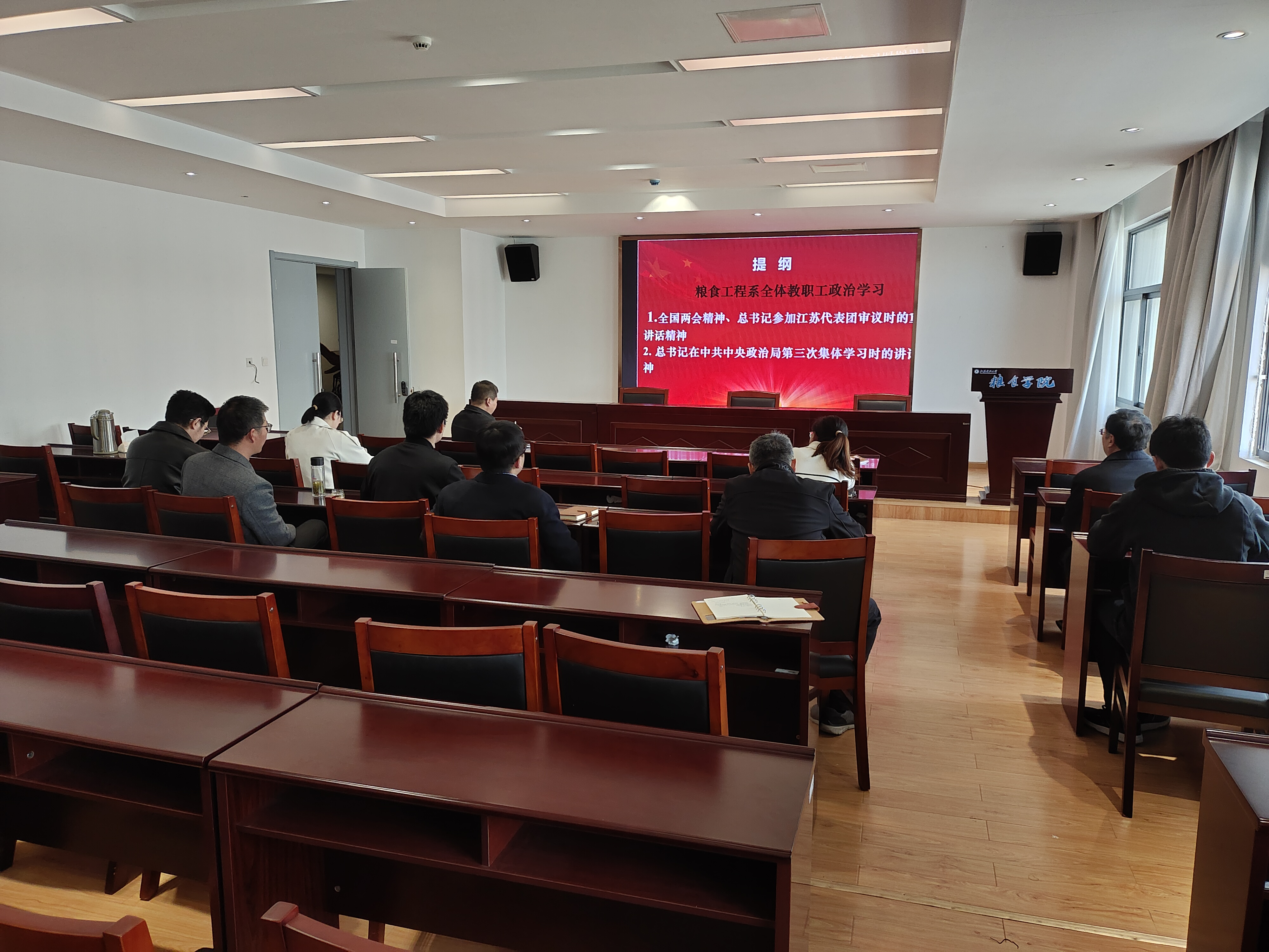 第二阶段,李波同志带领粮食工程系教职工集体学习了“李克强作的政府工作报告(摘登)”、“习近平总书记参加江苏代表团审议时的重要讲话精神”和“习近平总书记在中共中央政治局第三次集体学习时的讲话精神”。会后,全体教工根据学习内容,结合学校和学院的实际工作,围绕“结合学校发展态势,思考如何把握历史机遇,凸显办学特色,提升学科建设、人才培养、科技创新水平,全方位推动学校高质量发展。”这一主题,展开了积极的思考讨论,朱圆圆和李珍妮同志重点发言。