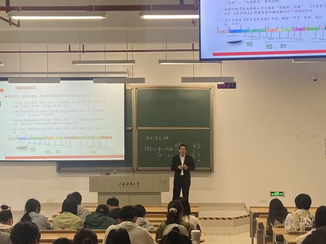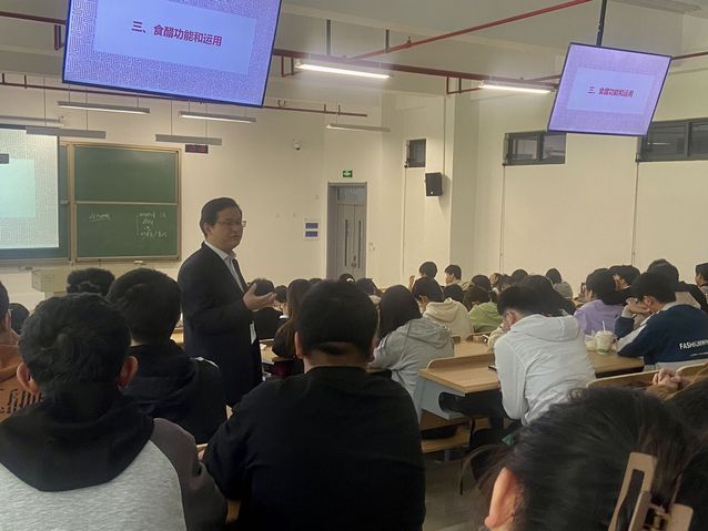 在本次讲座中,余院长用通俗易懂的讲解、贴近生活的实例和同学们互动交流。余院长首先从世界食醋和我国食醋的起源和种类开始,带领同学们走进食醋的历史与发展历程。同时比较其他国家与我国食醋品种的不同,重点介绍世界名醋和中国四大名醋的特点及酿制技艺。此外,余院长还介绍了食醋的功能和运用,以及如何挑选一瓶好醋。最后,余院长介绍了目前镇江香醋研究进展和研究内容,如微生物研究、产酸微生物分离及其应用和醋糟资源化利用研究。