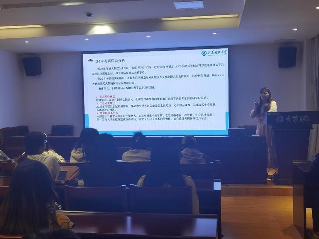 会议开始,武兆文老师结合学院考研前期摸底情况以及2024年考研难度进行系统分析,围绕“考研与就业形势”、“考研与就业如何协调发展”两个方面进行讲解,结合近几年学院的考研与就业数据、录取院校以及就业单位的实际情况,为同学们分析2024年考研与就业的趋势与动态,鼓励同学们在树立理想目标时,学会合理定位,用决心、信心、恒心去攻坚克难,在逐梦路上继续奋斗,以梦为马,不负韶华!
