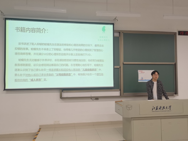 班会共分为三个环节:“心解码——常见心理问题介绍与解压方式分享”、“心悦读——心理书籍阅读分享”、“心思辩——心灵辩论”。在“心解码”环节中,许志和同学从大学生常见心理问题出发,就焦虑问题、抑郁问题、自卑心理、成瘾问题四方面展开,对问题成因进行分析,并给予合理的解决方法。在“心悦读”环节中,陈志健等四名同学向大家推荐了《蛤蟆先生去看心理医生》、《被讨厌的勇气》、《亲密关系》、《自卑与超越》等经典心理书籍,并分享了自己的阅读感悟。在“心思辩”环节中,8名同学分为两队,以“如果按一个按钮,就能精准删除令你不开心的记忆,要/不要按”为辩题,展开了激烈辩论。班会最后,同学们将手印按在“心心相印、扬帆远航”彩板上,手印相叠,携手共行。