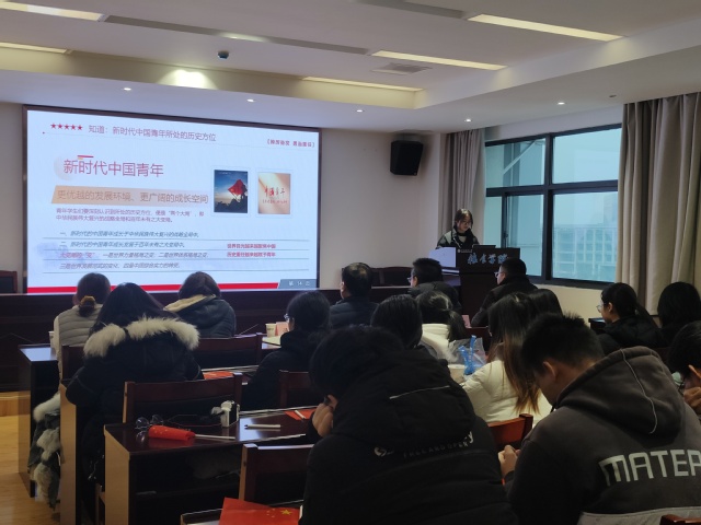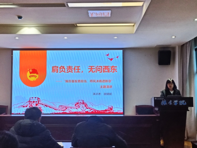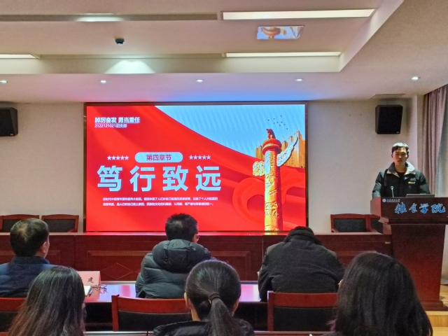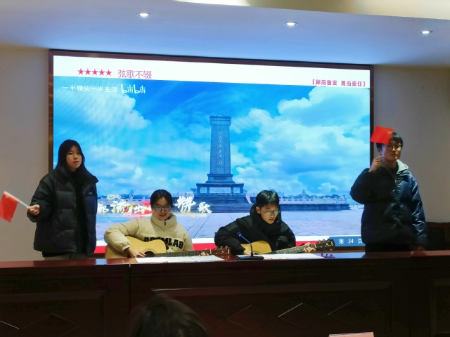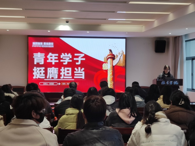 团课以“挺膺担当”为主题,分为“党史知识你划我猜”、团支书领学、“踔厉奋发勇担当栉风沐雨谱新篇”主题演讲、学生代表发言、《我和我的祖国》小合唱五个环节。在“你划我猜”环节,同学们在趣味答题中增进了对于党史知识的了解;团支书朱玙颉领学习近平总书记关于青年工作的重要论述、重要讲话,引导同学们要树立远大理想、热爱伟大祖国、担当时代责任、勇于砥砺奋斗、练就过硬本领、锤炼品德修为;两名同学从“天下兴亡匹夫有责”到“未来属于青年希望寄予青年”,从“小小红船”到“巍巍巨轮”慷慨激昂的演讲,表达了青年要挺膺担当、砥砺奋斗的决心;三名学生代表结合自身学习生活经历、未来发展规划汇报了参加此次团课的学习收获和心得体会;同学们在《我和我的祖国》歌声中,挥动国旗,感悟挺膺担当。