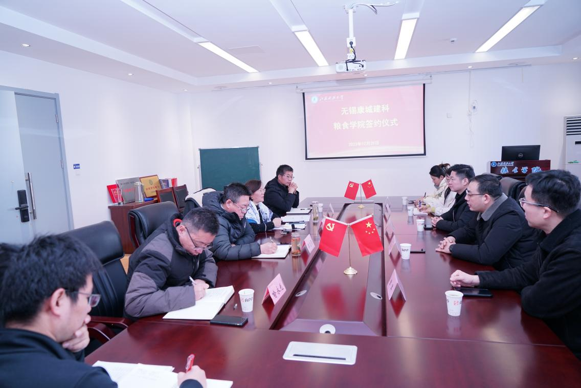 2023年12月20日上午,无锡康城建科董事长杭幸聪、常务副总谭云峰、国家粮食和物资储备局科学研究院战略物资管理技术研究所副所长张涛副研究员等一行到竞彩足球app 来访,洽谈交流双方共建合作平台等事宜。竞彩足球app 党总支书记梁忠臣、院长鲁玉杰等学院领导及粮食工程系教师代表参加了洽谈会。