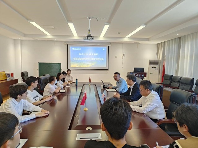 会议结束后,张汉乐董事长与学生代表在学院楼436进行交流座谈。张董事长与青年学生分享了自己的人生经历,并解答了同学们关于“职业与专业”“考研与就业”“能力与学历”等方面的困惑,寄语青年学子“干一行、爱一行、钻一行”,做到知行合一。
