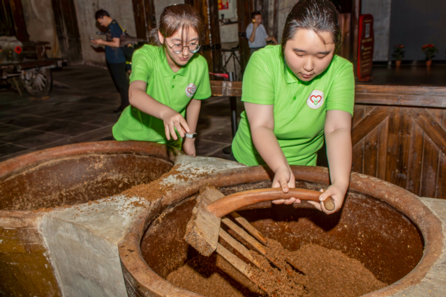 10日下午,营员们怀揣着激动与期待的心情,踏入了镇江恒顺醋业股份有限公司的大门。走进醋博物馆,仿佛穿越了时空的隧道,进入了一个充满香醋文化底蕴的世界。醋博物馆内丰富的展品与详实资料,生动呈现了镇江香醋的起源、发展及酿造工艺演变。在醋醅翻醅体验区,营员们化身香醋酿造师,亲身体验古法酿醋翻醅技艺。全球最大晒醋场里,一排排醋缸在阳光下闪耀,传统工艺与现代技术相结合的晒醋过程,展现出它独特得魅力。随后的智能灌装线,现代工业的高效与精准,让大家感受到科技给传统酿造业带来的变革。