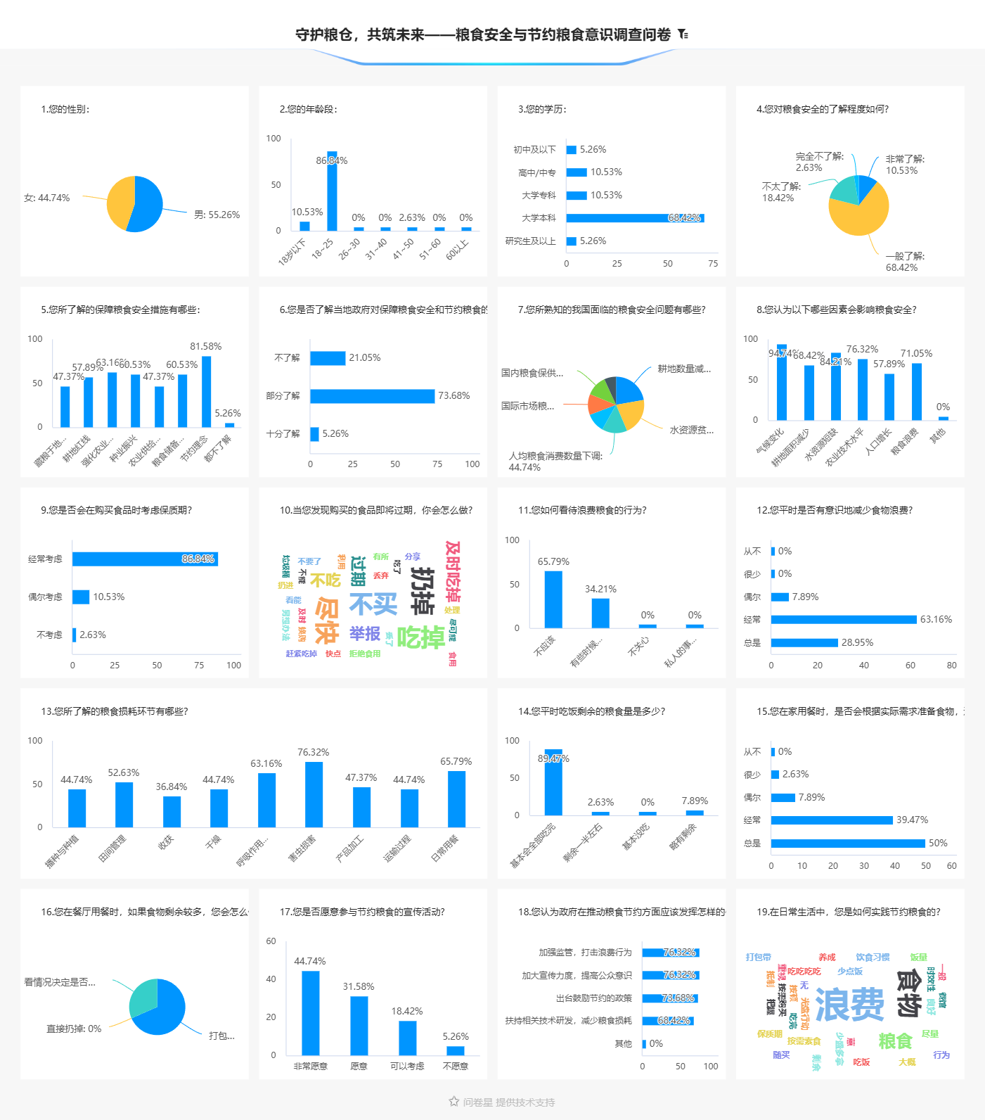 在线下活动开始之前,为了解公众对粮食安全的认知与态度,实践团开展了线上问卷调查。调查结果显示,大部分受访者对粮食安全有一定的了解,在平时日常生活中都会有意识地节约粮食,认为粮食安全是国家民生的重要保障。但同时,部分受访者对粮食安全的认知存在误区,如认为我国粮食生产已经过剩,不需要过多关注粮食安全问题。