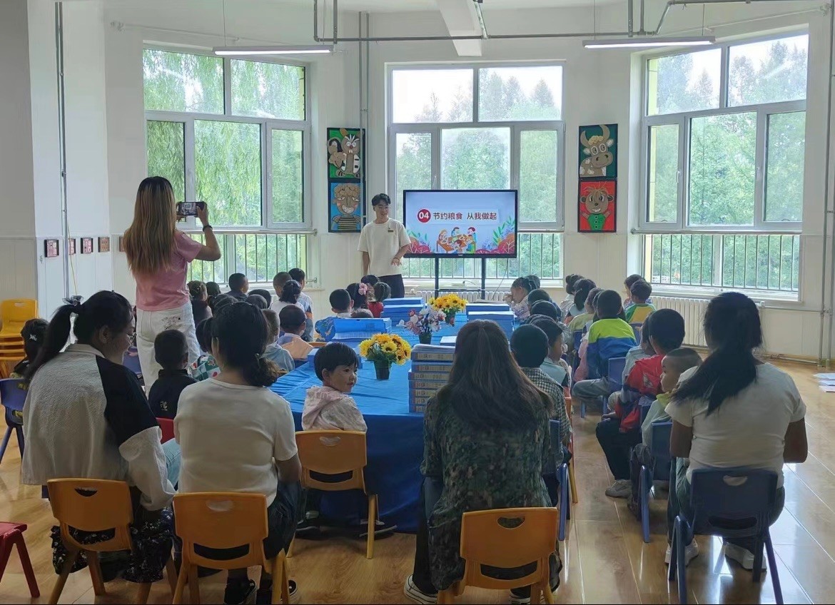 为了让更多人群了解粮食安全知识,实践团走进了幼儿园和中学,开展线下宣讲活动。在青海省西宁市湟中区拦隆口镇幼儿园,实践团成员讲述关于珍惜粮食的故事,并设计了一个“种粮食,收粮食”的游戏,让孩子们在游戏中了解粮食生长的过程。