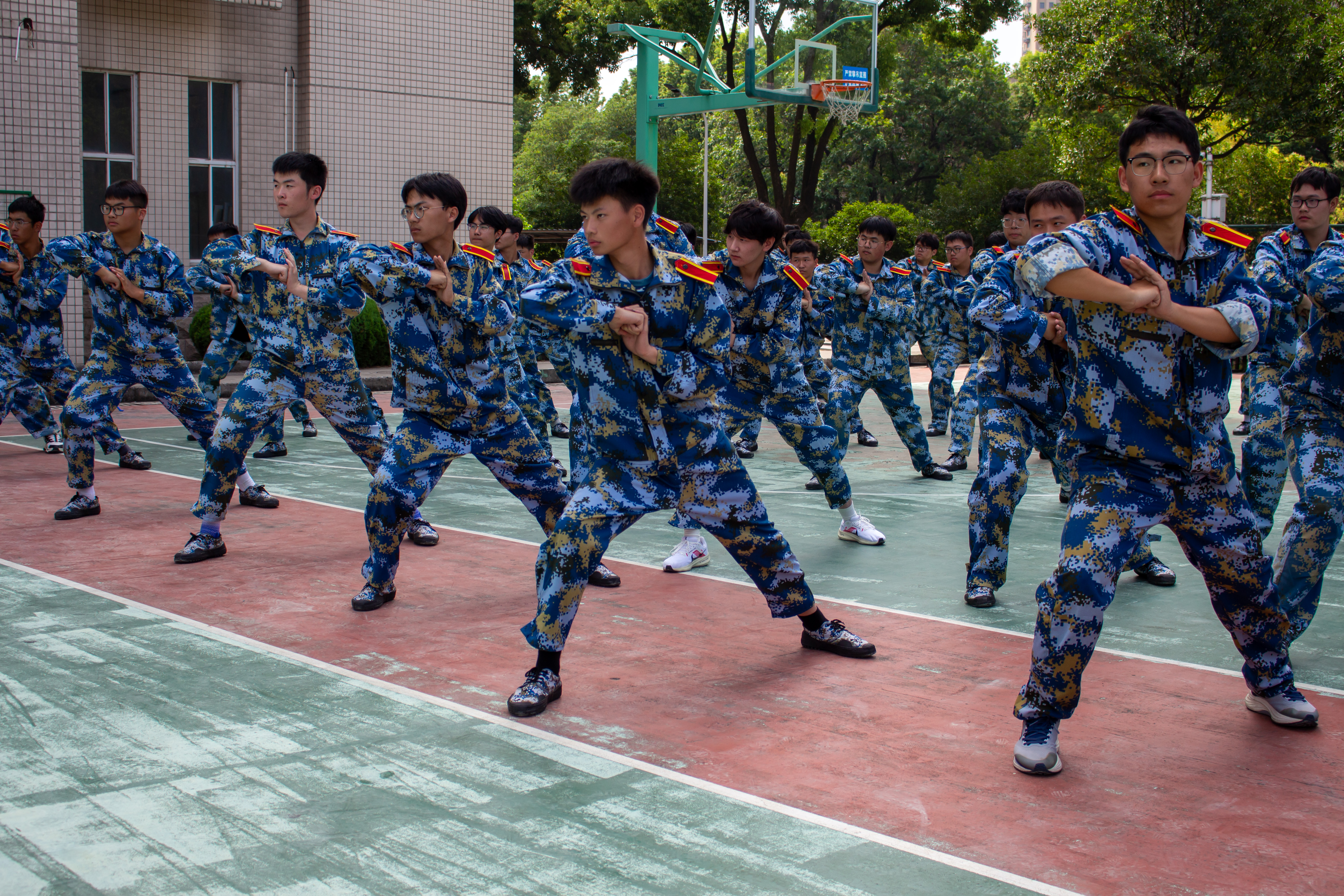 军中体术,拳中生花。拳风所至,意志如钢。身形矫健,步伐坚定。拳法如诗,动作如画。汗水铸就,钢铁之躯。在军体拳训练中,新生们将所学技能展现得淋漓尽致,赢得了观摩学长学姐的阵阵掌声。