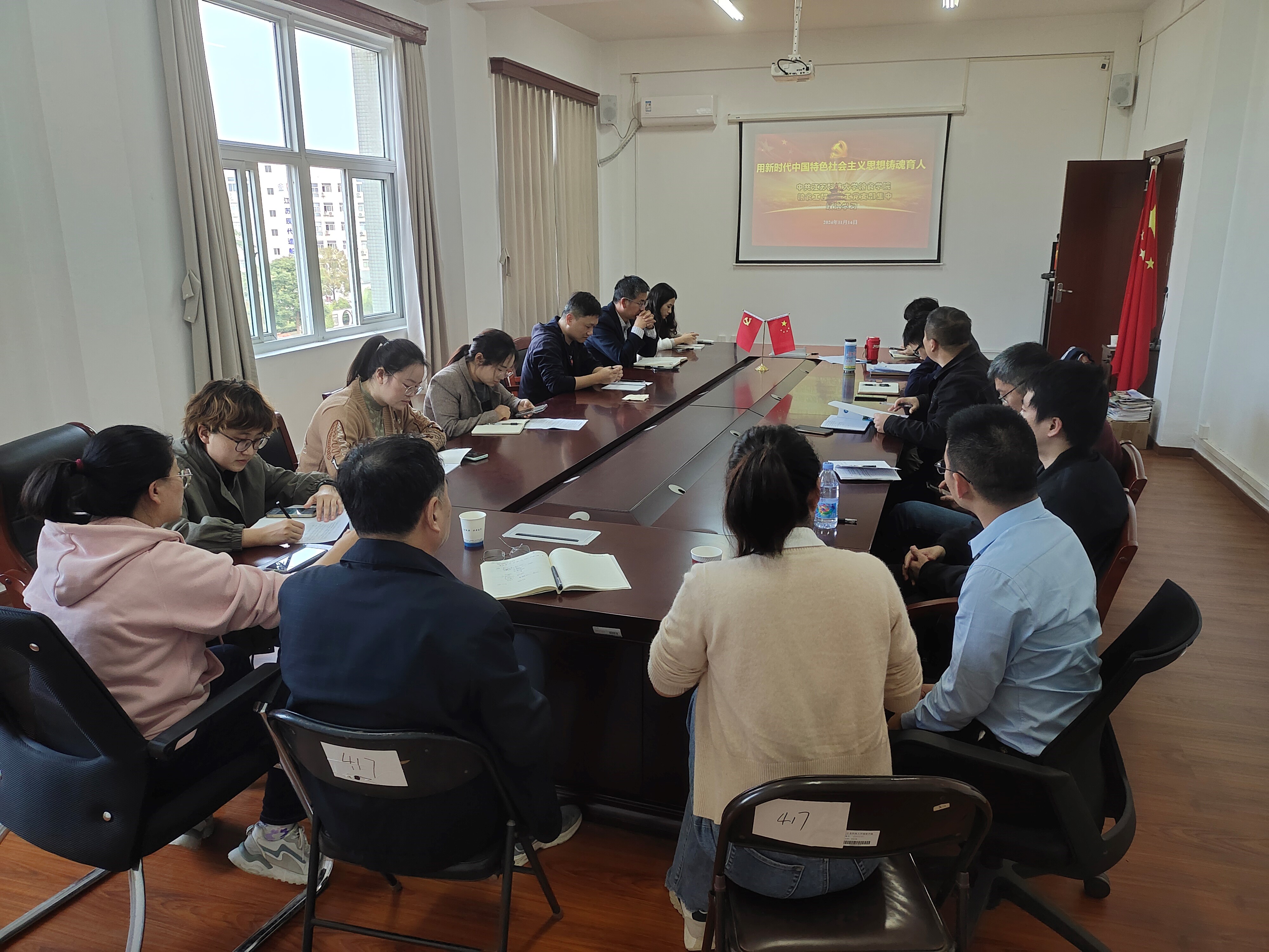11月14日下午,粮食工程系教工党支部组织全体党员参加政治理论学习,本次学习分为两个阶段进行。第一阶段,贾俊强同志领读了“教育部关于印发《新时代高校教师职业行为十项准则》的通知”、“习近平总书记关于推进高质量发展的重要论述”和“习近平总书记关于新质生产力的重要讲话”文件。苗世远老师提出高校教师应当以创新为驱动,深化教学改革,将理论与实践相结合,培养学生的创新精神和实践能力。聚焦国家重大战略需求,加强科研攻关,产出具有国际影响力的高质量成果,推动学科交叉融合,形成特色鲜明的学科优势。