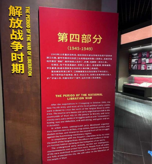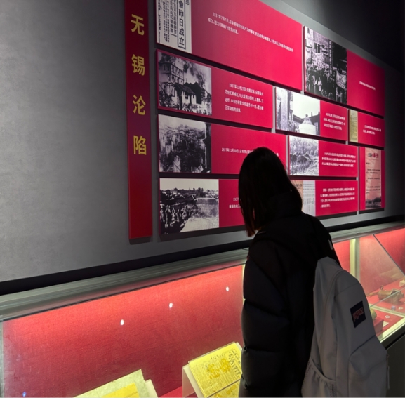 2025年1月20日实践团成员来到无锡博物馆革命历史馆展馆二进行参观学习。在博物院的四层无锡革命陈列馆,我们跟随讲解员的步伐,认真参观了《血与火的城市记忆——无锡革命史》展厅。展厅内,从1919年“五四”运动起至1949年中华人民共和国成立的革命斗争历程被生动再现。参观过程中,讲解员详细介绍了党的创建和大革命时期、土地革命时期、抗日战争时期、全国解放战争时期四个阶段的发展历程。无锡人民在中国共产党的领导下,经历了艰苦卓绝的革命斗争,哺育了一批批优秀的共产党员和英雄儿女。荣毅仁、秦邦宪等先锋人物的光辉事迹,让我们深受感动,更加坚定了听党话、跟党走的信念。
