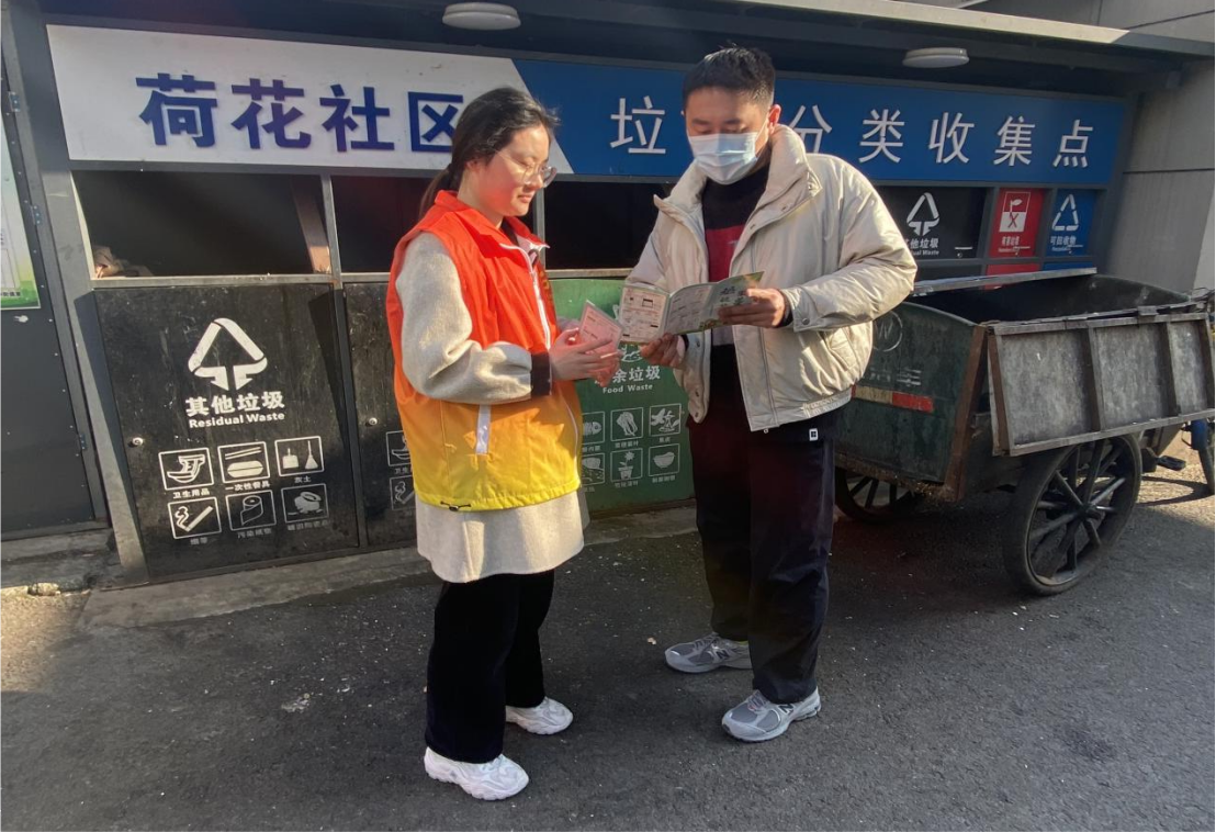 图为实践团成员李竹萱同学在向居民分发垃圾分类手册